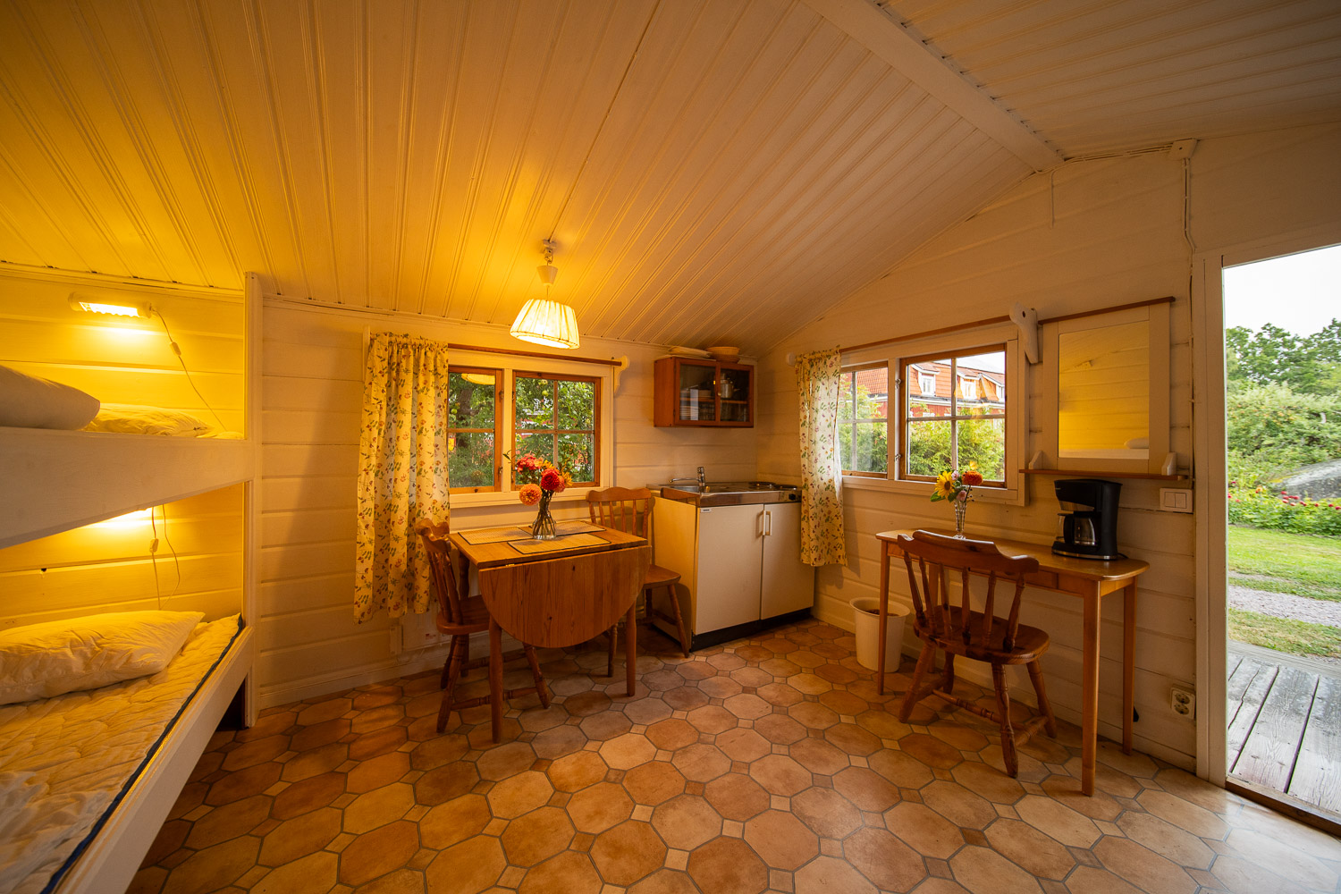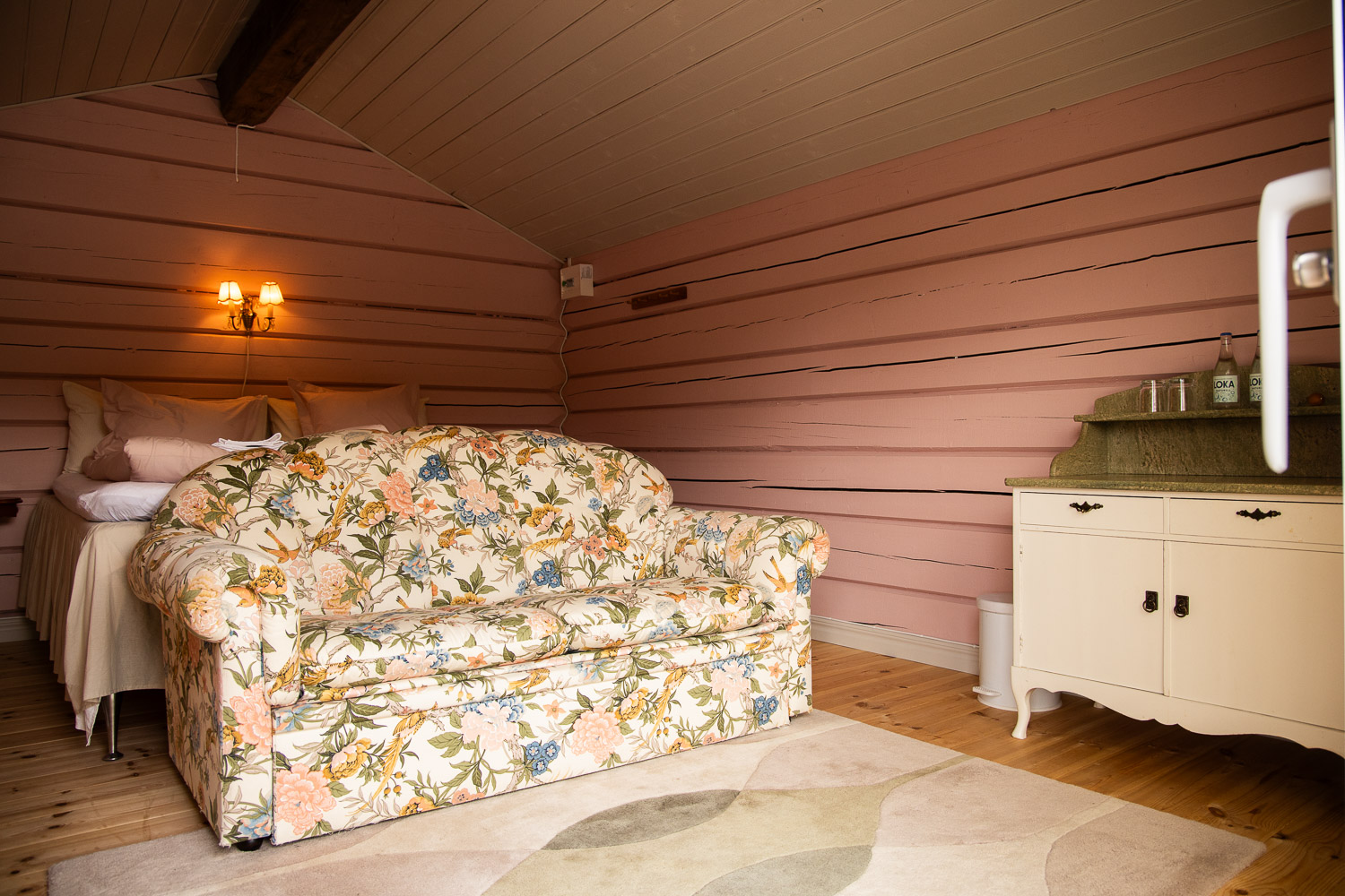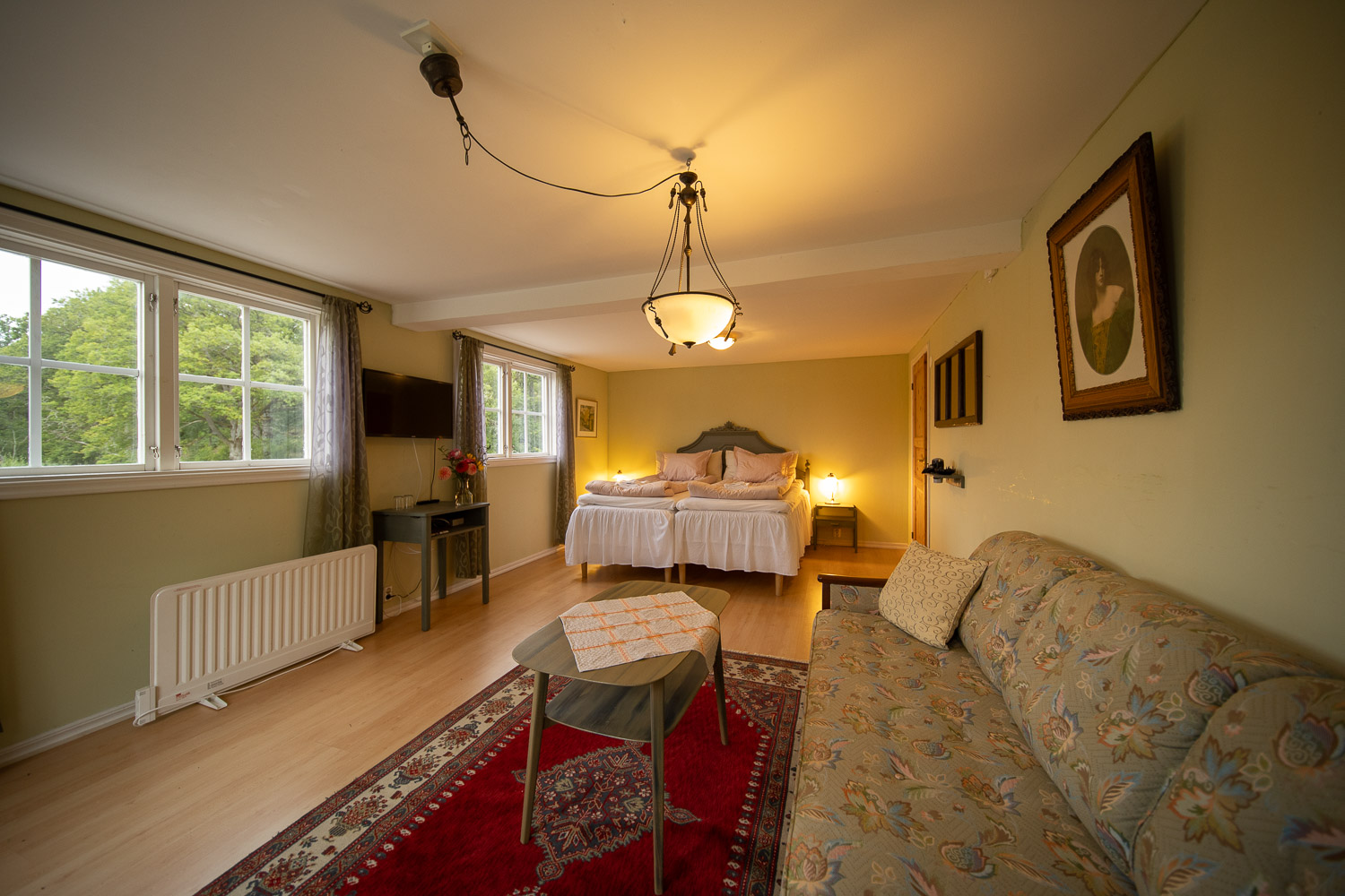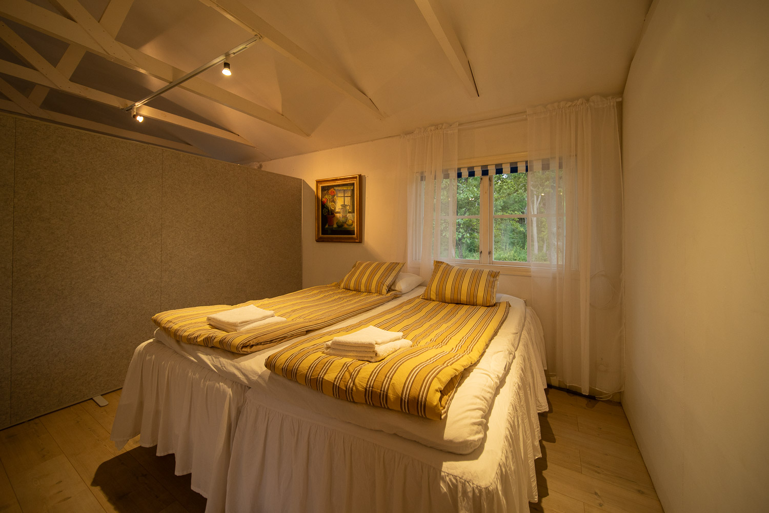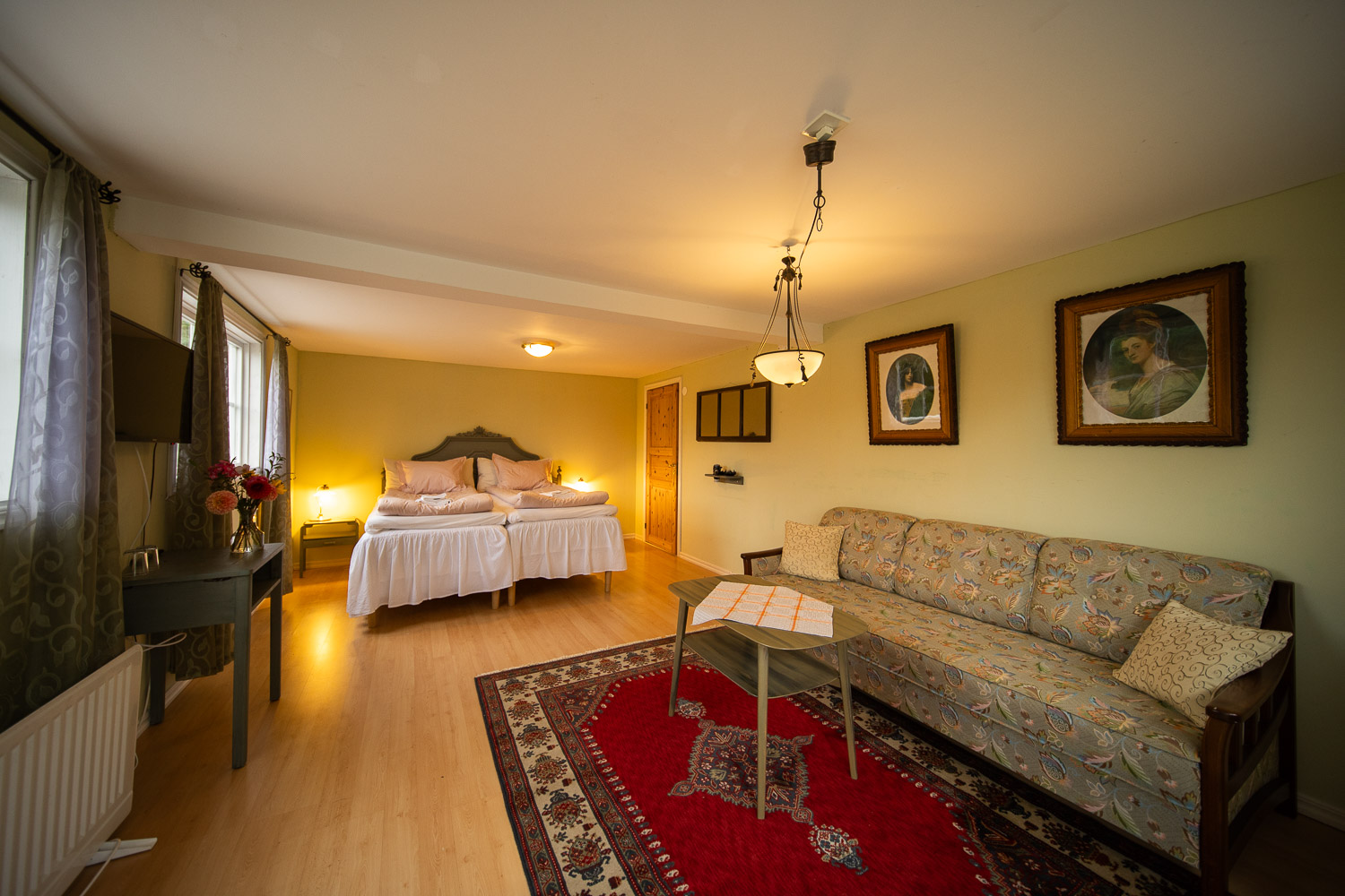 Här finns en dubbelsäng 180cm, samt en bäddsoffa med en extra bädd.