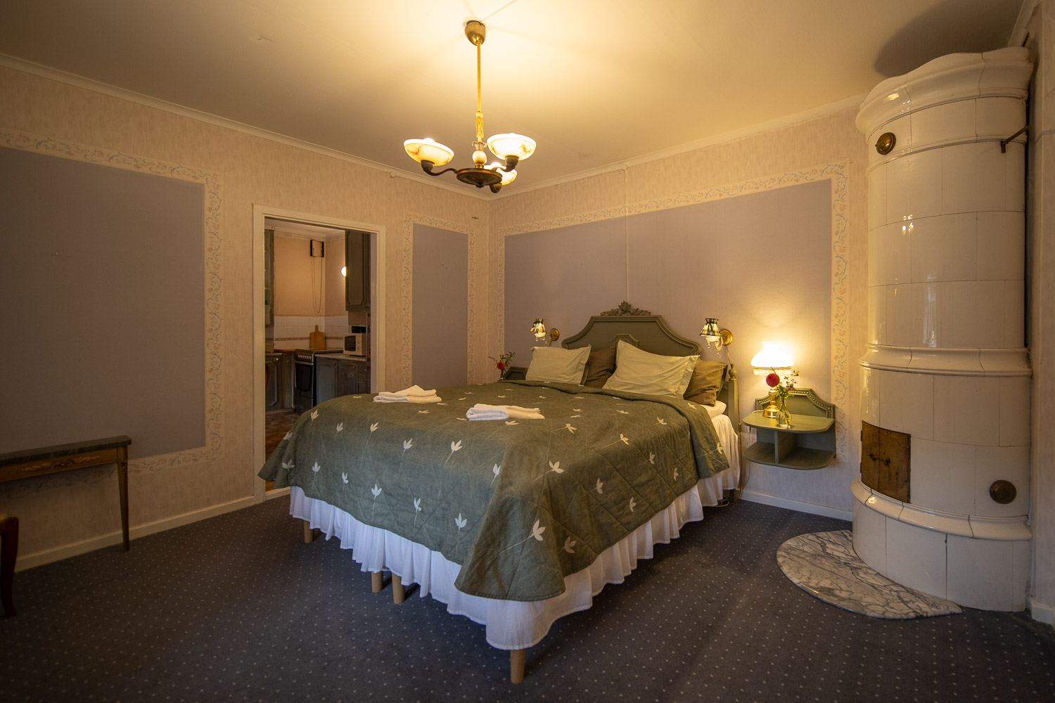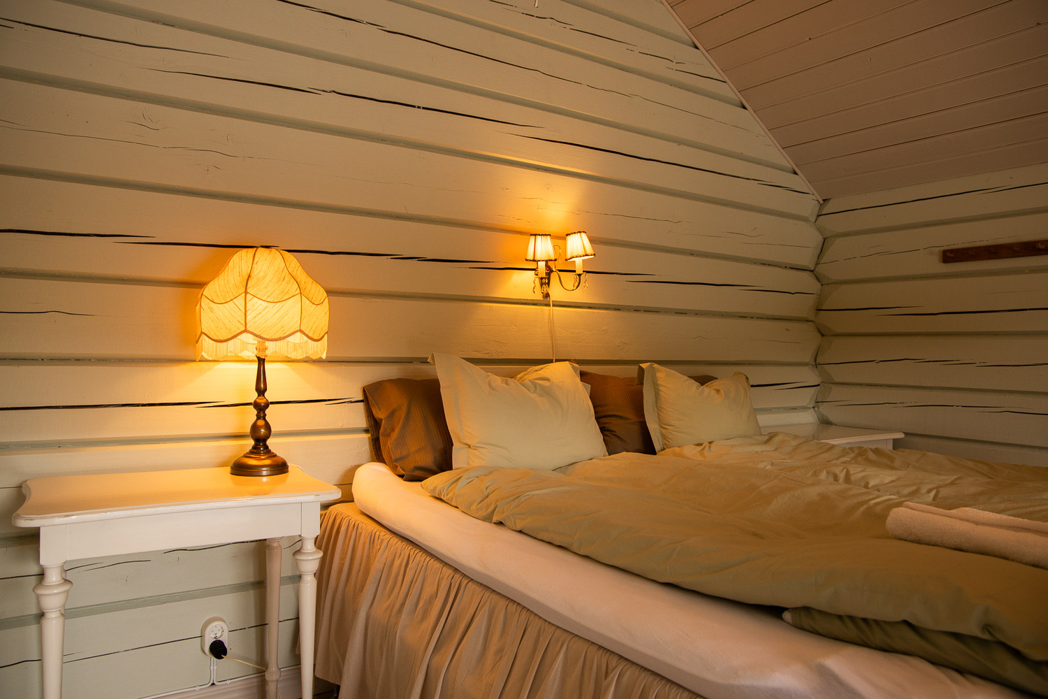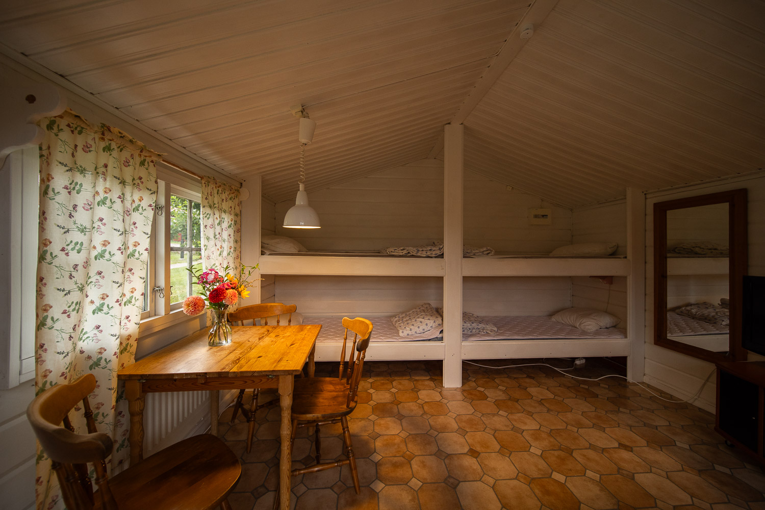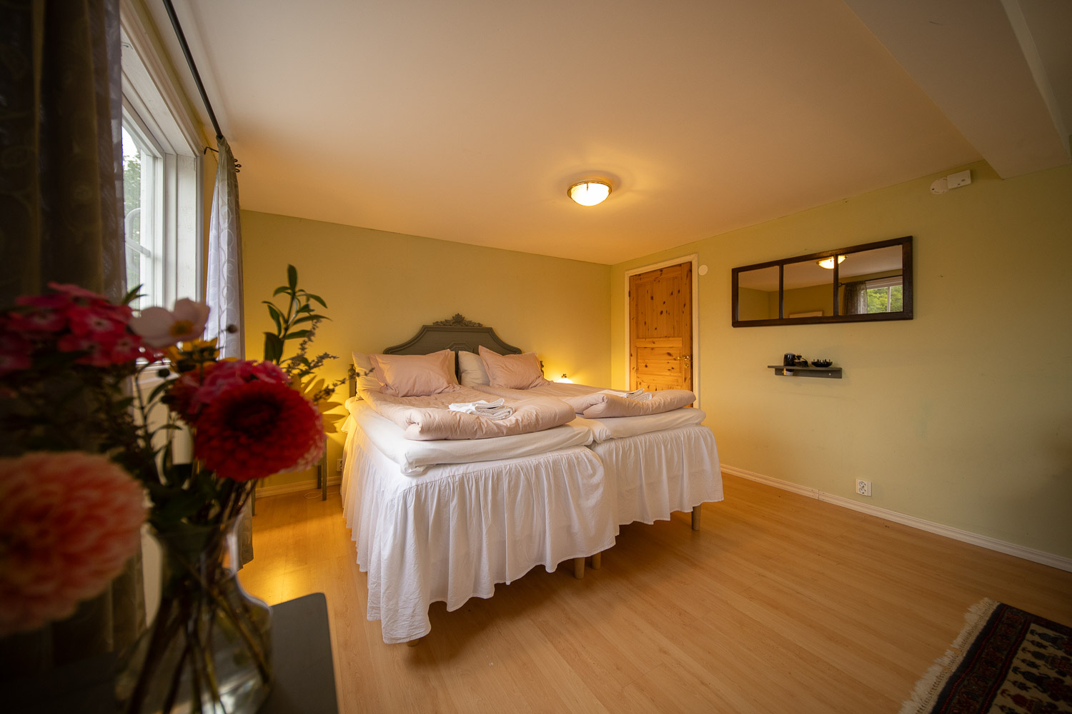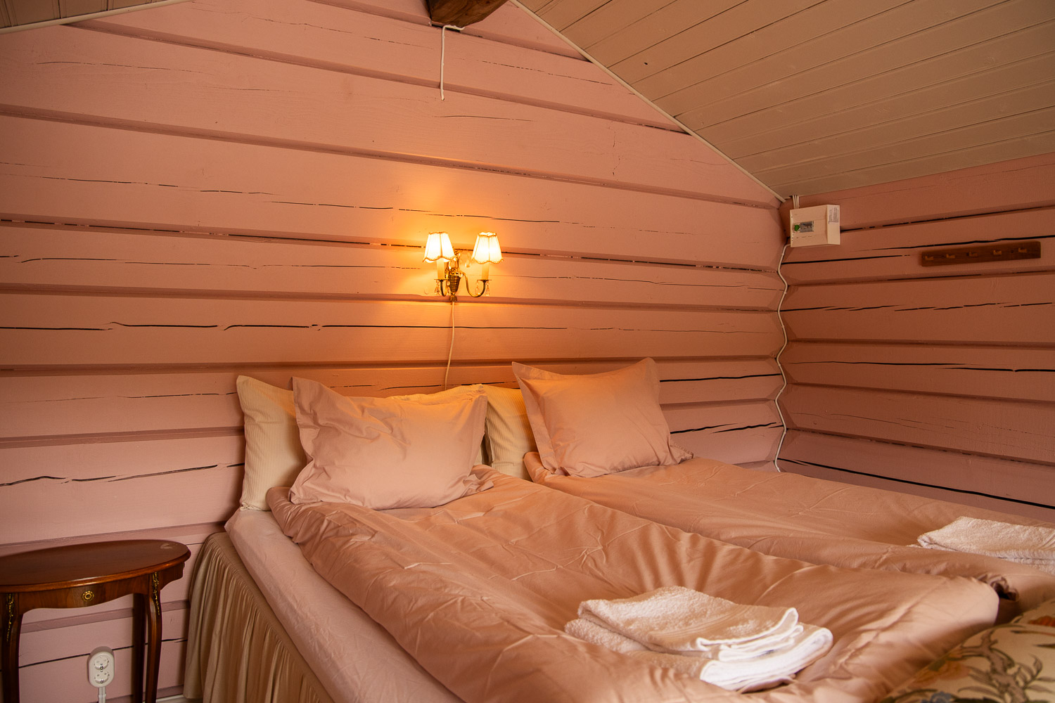 Här finns en dubbelsäng 180cm, samt en bäddsoffa med en extra bädd.