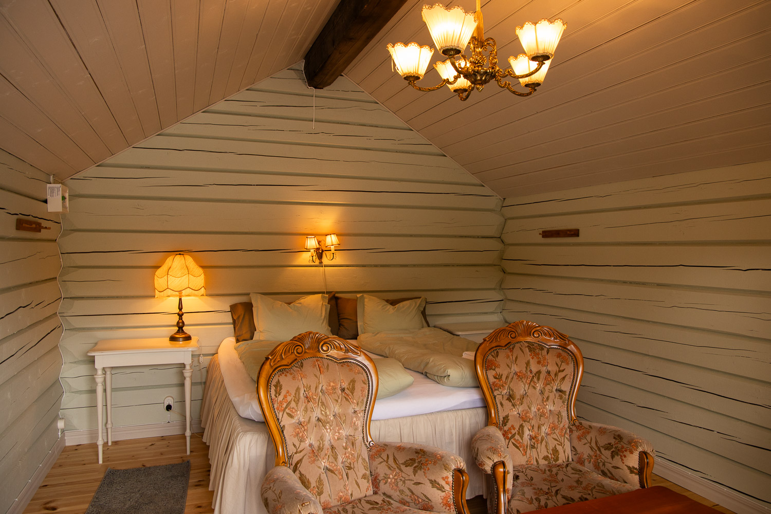 Här finns en dubbelsäng 180cm, samt två fotöljer.