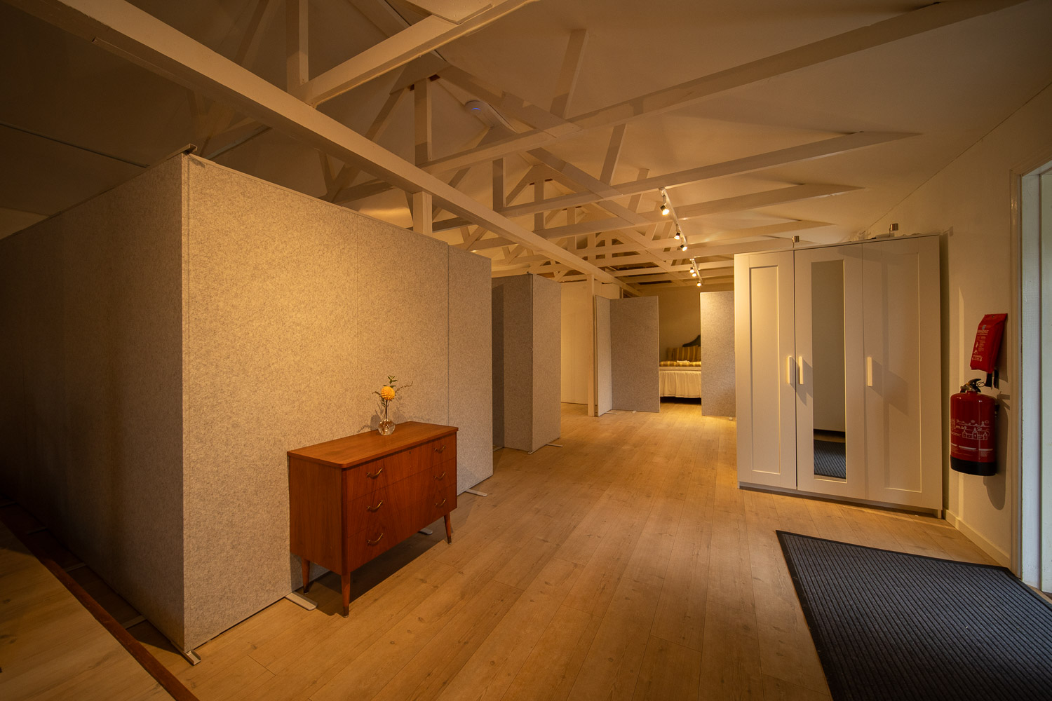 Det är endast skiljeväggar mellan rummen och öppet upp till nock.